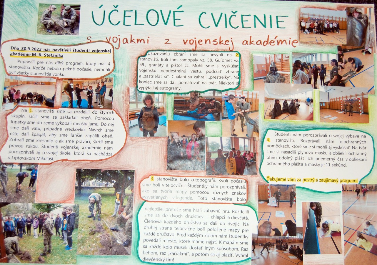 Cvičenie viedli nrtm. Sekan a nrtm. Knižka s desiatimi kadetmi, ktorí žiakov aktívne zapájali do jednotlivých činností, z čoho mali žiaci 2. stupňa veľkú radosť. Ako poďakovanie za aktívnu spoluprácu vytvorili následne na triednických hodinách a výtvarnej výchove básne, kresby i plagáty zachytávajúce zážitky z cvičenia. Tie nám spolu s ďakovným listom od pani riaditeľky poslali na akadémiu, čo nás veľmi milo prekvapilo. Ako nám v ďakovnom liste napísala p. riaditeľka: „Žiaci po cvičení spoločne s učiteľmi diskutovali o prežitých okamihoch s vojakmi a o tom, čo ich najviac zaujalo, čo im cvičenie dalo.“