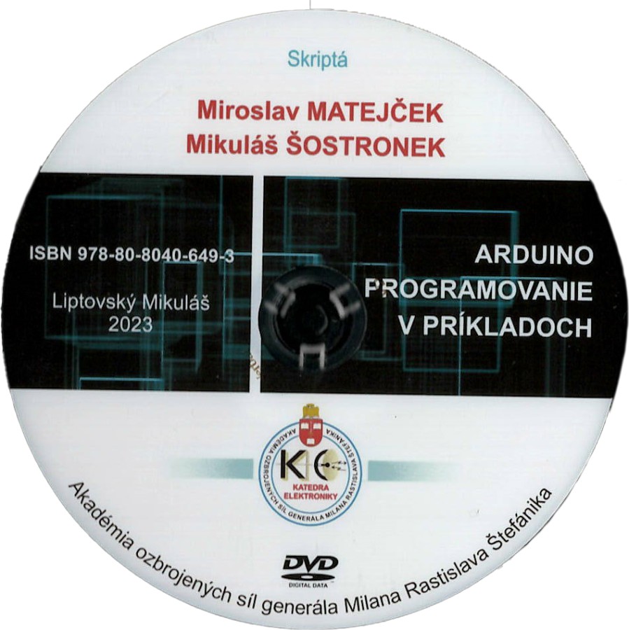 MATEJČEK, Miroslav a Mikuláš ŠOSTRONEK. Arduino programovanie v príkladoch [CD-ROM]. Prvé vydanie. Liptovský Mikuláš: Akadémia ozbrojených síl generála Milana Rastislava Štefánika v Liptovskom Mikuláši, 2023. ISBN 9788080406493.