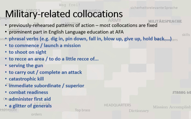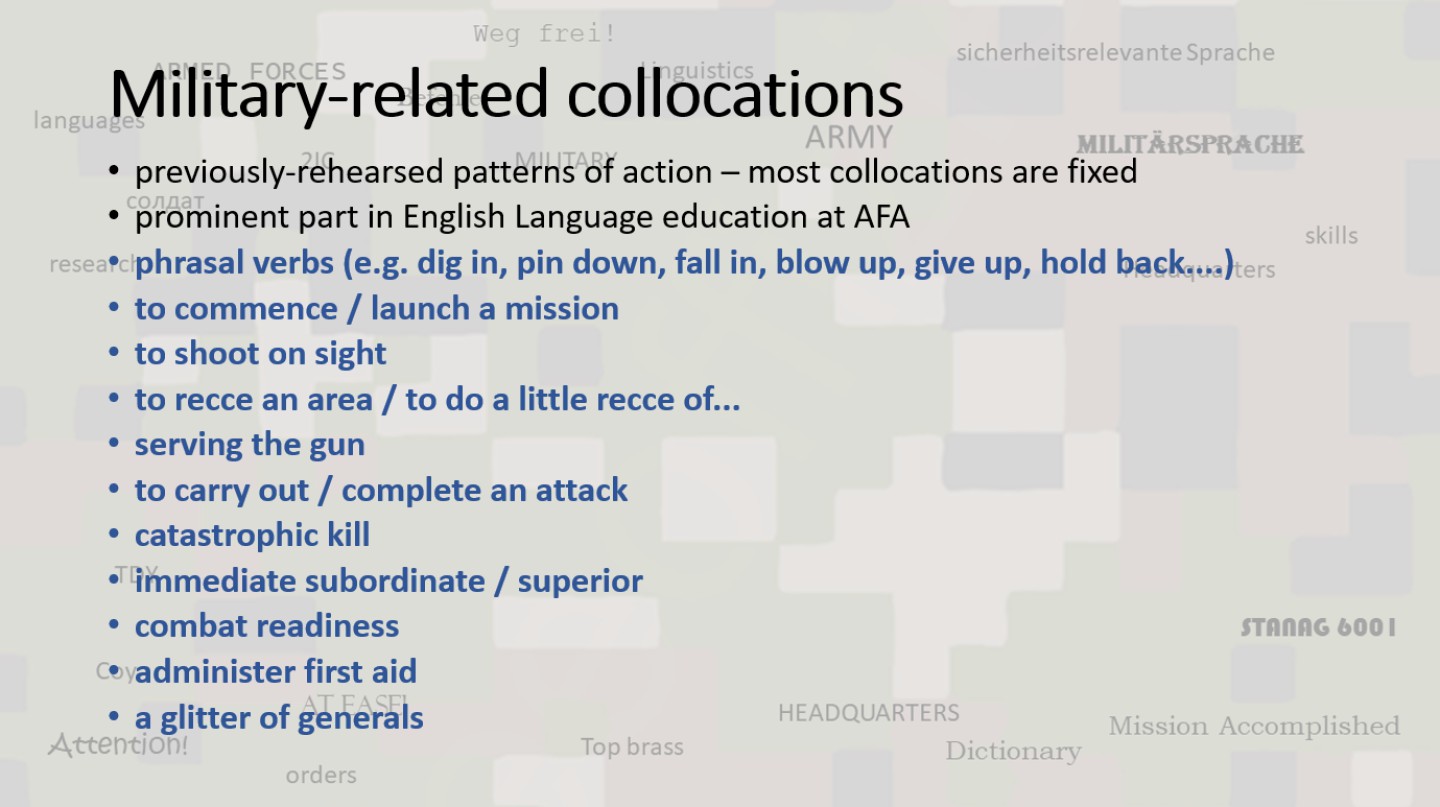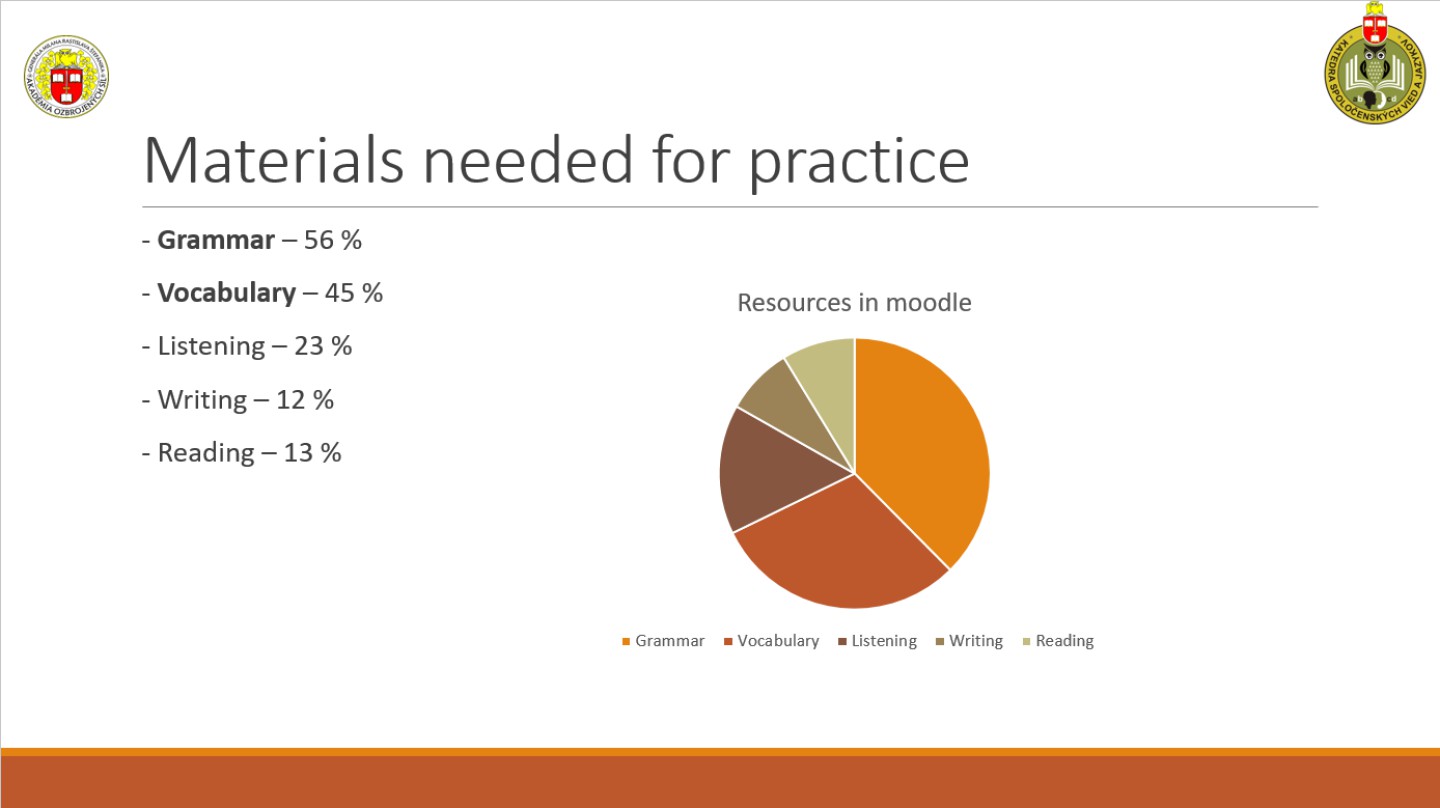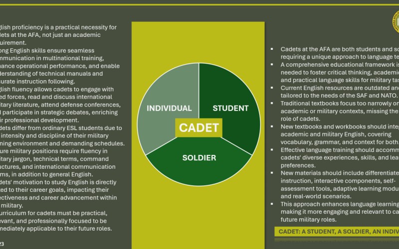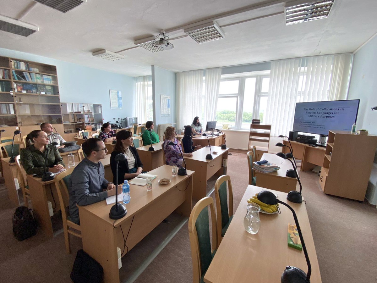 During the conference "New trends of professional training in armed forces and security forces", held May 23rd 2024 and organized by the Department of Social Sciences and Languages, three contributions were made in the language section. For an introduction Mgr. Eva Révayová, PhD. presented the project: Implementation of e-learning forms of teaching foreign languages in the environment of the Department of Defense, in which foreign language teachers engage in scientific research. Then she presented her research on the role of collocations in a military context (The Role of Collocations in Foreign Languages). In the second contribution, research was presented on Foreign language teaching for cadets supported by teaching in LMS moodle, in which Mgr. Katarína Hološová showed the results of a survey on the need for digital resources for cadets. The questionnaire was filled out by all second-year cadets who will take the STANAG 6001 exam next year. The third contribution was made by Lieutenant Mgr. Michaela Zátureczká (Integration of the military program into the teaching of the English language). She proposed the creation of three textbooks and three workbooks for AFA cadets. The content would be applied to the specific position of the cadets and focus on the needs of their personalities as well as their status as students and soldiers.