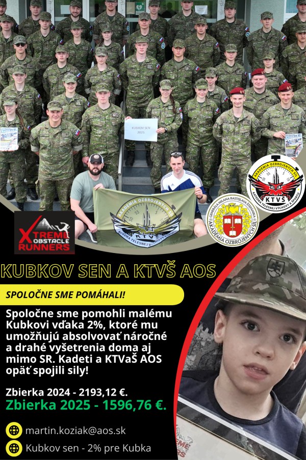 Kubko prišiel na svet nečakane 3. januára 2018, v 31. týždni tehotenstva a odvtedy je jeho každodenný život plný náročnej rehabilitácie, liečby a boja o každý krôčik vpred. Jeho rodina vníma podporu kadetov a najmä Katedry telesnej výchovy a športu AOS s obrovskou vďačnosťou, čoho dôkazom sú aj slová venované všetkým prispievateľom: „Milá Katedra telesnej výchovy a športu, milé kadetky, milí kadeti. Ďakujeme Vám úprimne za Vašu pomoc a podporu cez 2 % z daní. Vaša solidarita má pre nás nesmierny význam – najmä pre nášho Kubka, ktorý od narodenia statočne bojuje a potrebuje nás všetkých. Ste pre nás veľkou inšpiráciou – dokazujete, že keď sa dobrí ľudia spoja, dokážu veľké veci. Vaša pomoc nám dodáva silu a nádej. Veríme, že aj budúci rok budete stáť pri Kubkovi. Spolu to zvládneme ešte lepšie! S láskou a vďakou, Kubko a rodičia.“