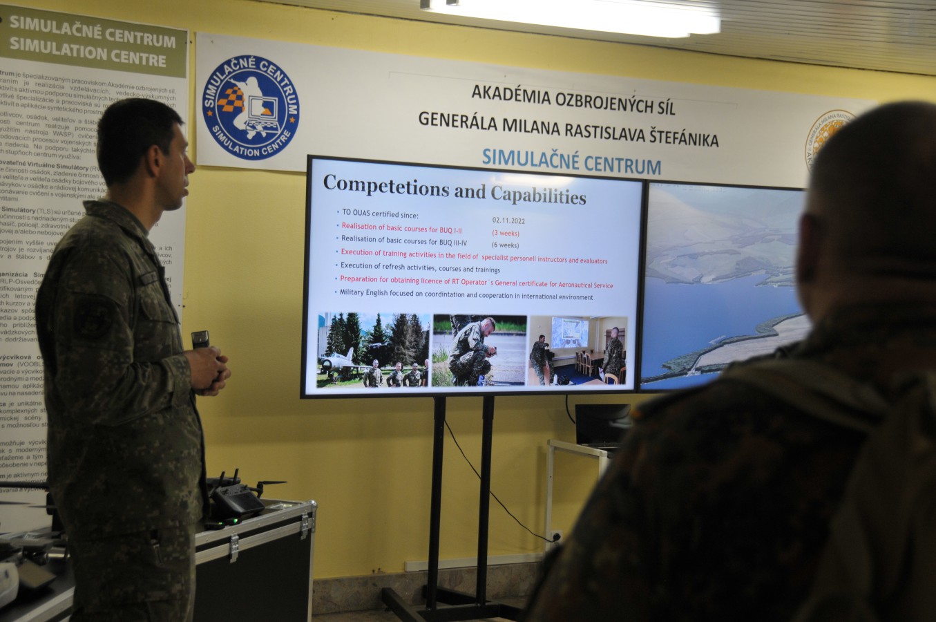 Súčasťou návštevy bola úvodná prezentácia, v ktorej bola delegátom priblížená štruktúra, hlavné činnosti a vzdelávacie zameranie AOS. Program pokračoval prehliadkou Simulačného centra, kde mohli hostia vidieť praktické ukážky na streleckom a rekonfigurovanom virtuálnom simulátore, ďalej im boli predstavené spôsobilosti certifikovaných výcvikových organizácií pre RLP a operátorov bezpilotných leteckých systémov.